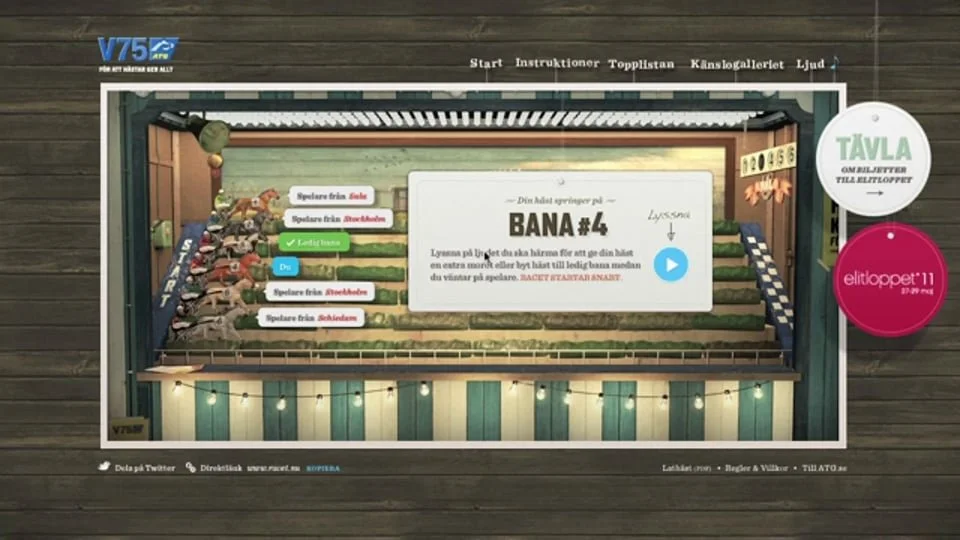 We wanted to engage a new younger audience in horse racing. So we invented The Race - The world's most emotional game. The Race is a realtime multiplayer game where you compete against up to five other people on the net. But we wanted to involve more senses than usual to create an emotional response. In gameplay you can therefore use your voice (through the built-in microphone) to cheer your horse forward. We have also used the webcam to create an unusual photo finish where people can easily share evidence of their emotional response to the game with others. The design is inspired by the classic/retro Kentucky Derby which could be found at fun fairs in the past.